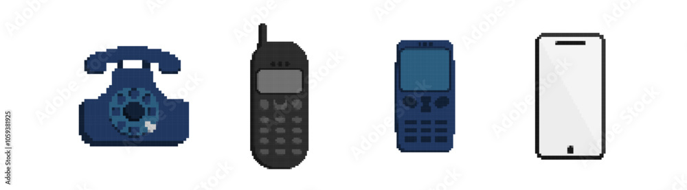 The watermark will not be included on Wall mural.: Pixel retro and modern phones set - evolution of communication devices from disk with handset to push