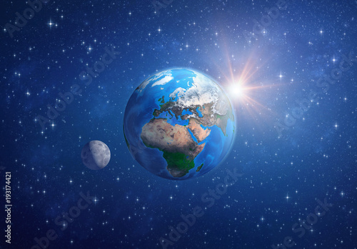 Wall mural : Planet earth, the moon and the sun in deep space -