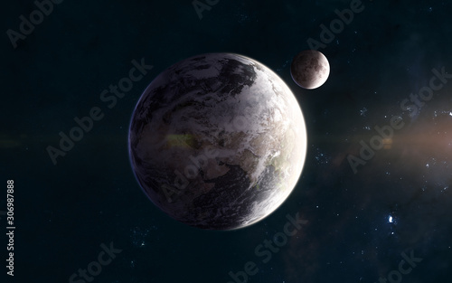 Wall mural planet earth and moon in warm light of sun. solar system. science fiction. elements of this image fu - Wall murals Wall mural planet earth and moon in warm light of sun. solar system. science fiction. elements of this image fu - Wall murals