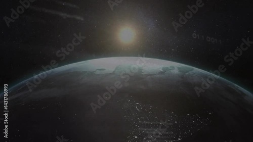 Wall mural planet earth drifting across cosmic void in 3d render, showing solar glow and digital code overlay