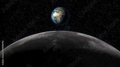 Planet earth rising over the moon horizon, in full view - digital 3d illustration - elements of this iWall mural