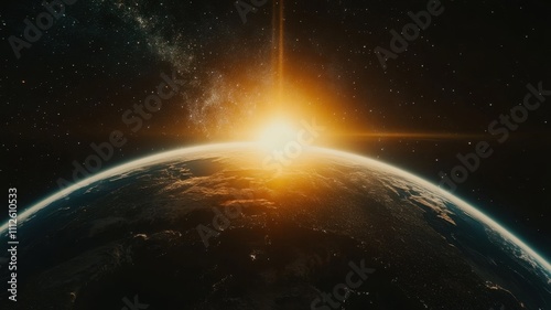 Wall mural : Planet earth rotating in space with sun shining from behind with sunrise behind the planet, backgrou