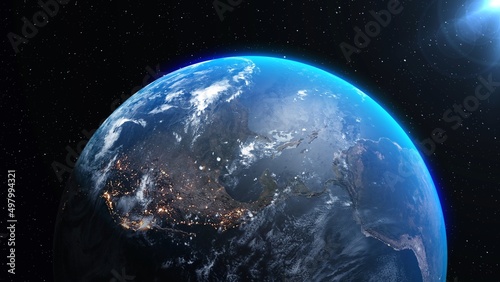 Wall mural : Planet earth with realistic geography surface and orbital 3d cloud atmosphere - outer space view of