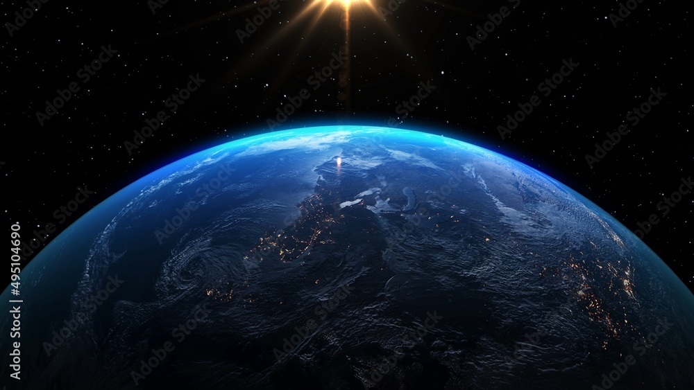Wall mural : Planet earth with realistic geography surface and orbital 3d cloud atmosphere - outer space view of