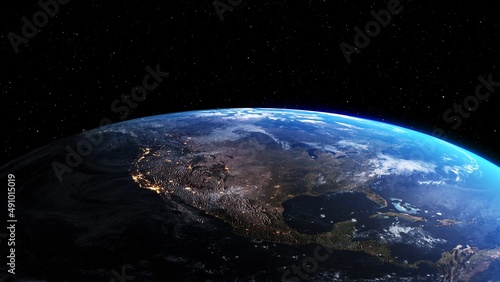 Wall mural : Planet earth with realistic geography surface and orbital 3d cloud atmosphere - outer space view of