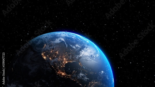 Wall mural : Planet earth with realistic geography surface and orbital 3d cloud atmosphere - outer space view of