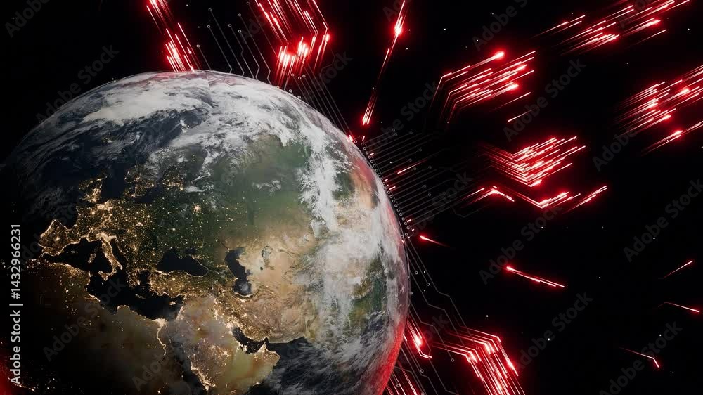 Wall mural planet earth with visible europe at night and glowing red digital arrows in outer space. 3d render r