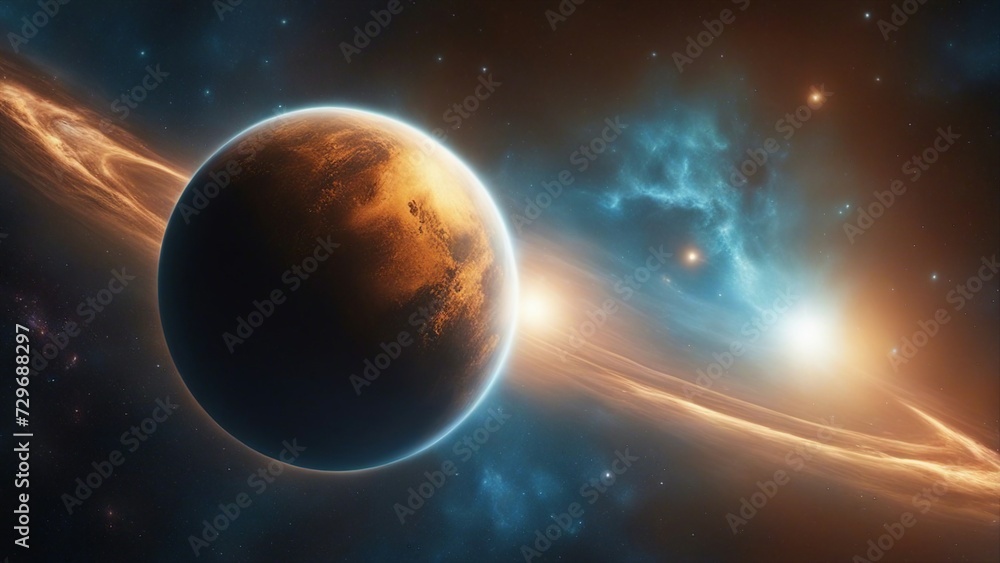 Wall mural planet in space an outer space view of an alien planet and a blue nebula. - Wall murals Wall mural planet in space an outer space view of an alien planet and a blue nebula. - Wall murals
