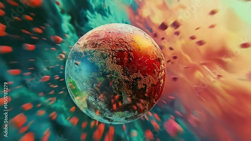 The watermark will not be included on Wall mural.: Planet is shown in a space with many red and blue objects - the planet is surrounded by a lot of debr