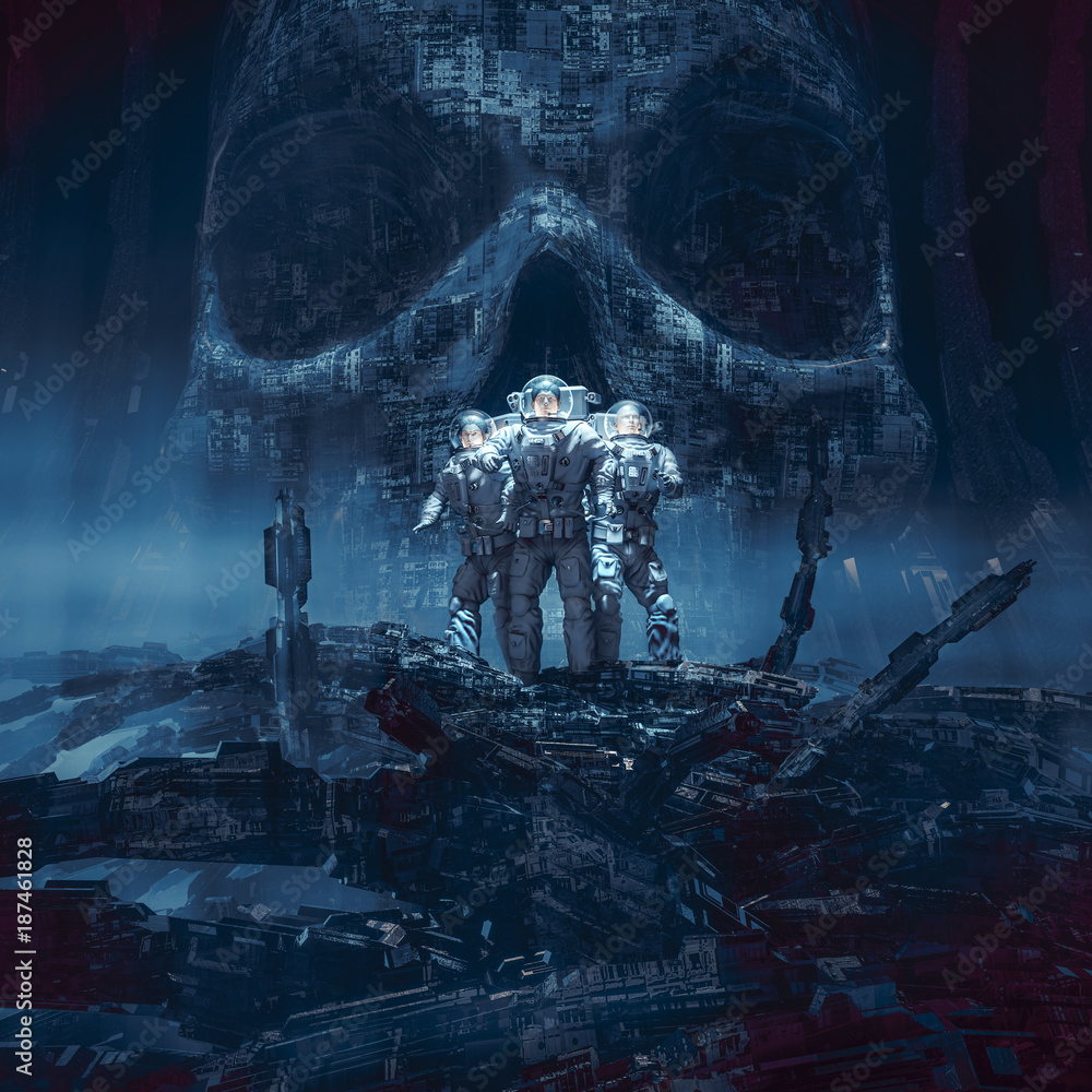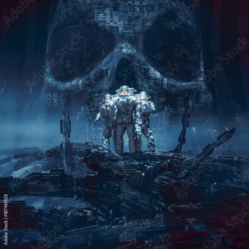 Wall mural planet of doom / 3d illustration of group of astronauts standing in hostile alien environment in fro - Wall murals Wall mural planet of doom / 3d illustration of group of astronauts standing in hostile alien environment in fro - Wall murals