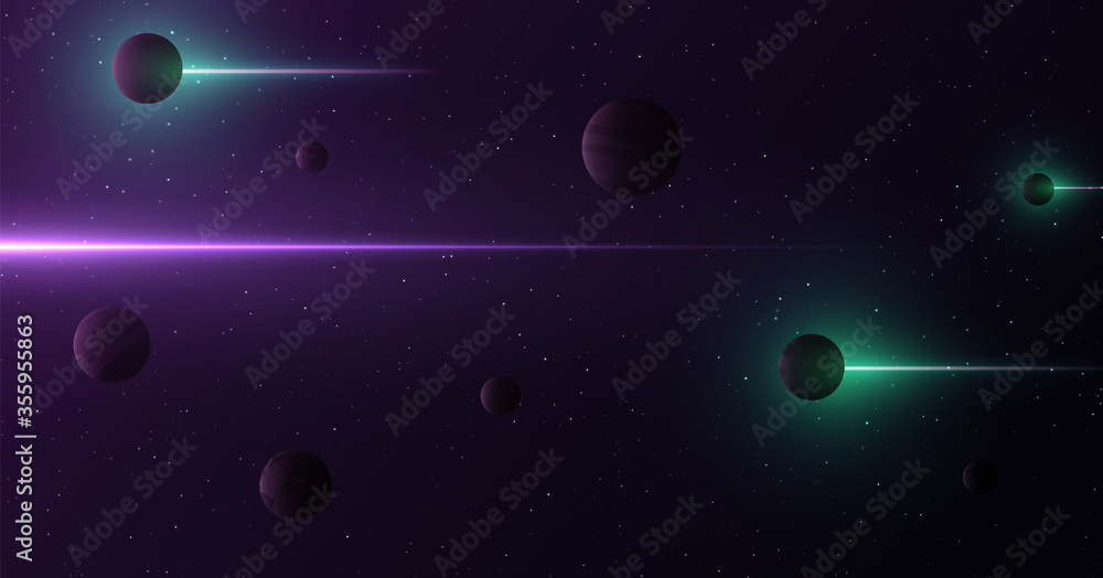 The watermark will not be included on Wall mural.: Planets 3d on background of stars and galaxy - light abstract lines of gamma rays pass through space -