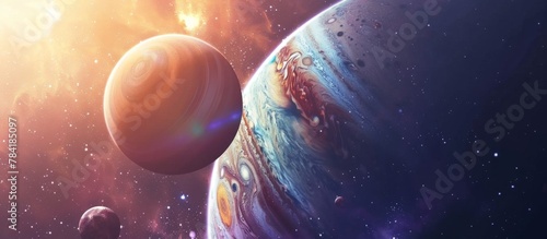 The watermark will not be included on Wall mural.: Planets floating gracefully in the vastness of outer space, bathed in the radiant glow of a brillian