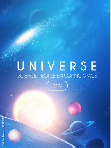 Wall mural planets in universe with star, nebula and galaxy lights. 3d realistic space. cosmos design. - Wall murals Wall mural planets in universe with star, nebula and galaxy lights. 3d realistic space. cosmos design. - Wall murals