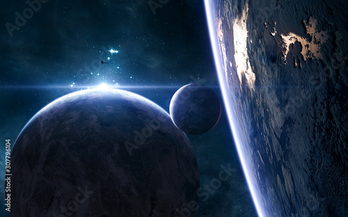 Wall mural planets of deep space in blue rays of a star cluster. science fiction. elements of this image furnis - Wall murals Wall mural planets of deep space in blue rays of a star cluster. science fiction. elements of this image furnis - Wall murals