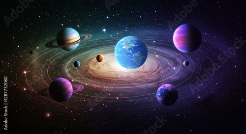 Wall mural : Planets orbit a galaxy creating a colorful cosmic scene