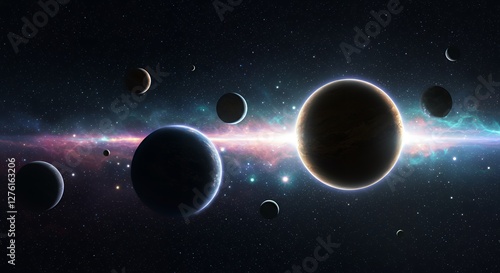 Wall mural planets orbiting in deep space with starfield and nebula background