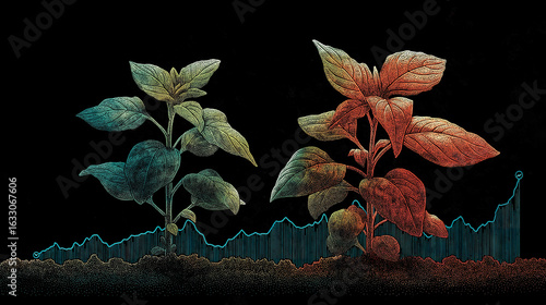 The watermark will not be included on Wall mural.: Plants sprouting from soil linked by graph line illustrating development and financial success