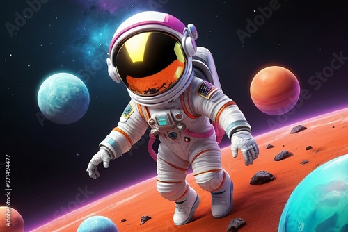 The watermark will not be included on Wall mural.: Playful astronaut with a colorful space suit and a floating helmet, exploring an alien planet in 3d