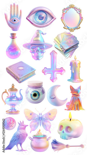 Wall mural png 3d iridescent mystic witchcraft design element set, transparent background