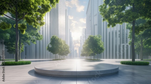 Podium on the background of a big city street - an empty showcase for displaying goods - 3d rendering - Wall mural