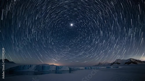 The watermark will not be included on Wall mural.: Polaris appears as a fixed point while other stars swirl in arcs around it over an arctic icy landsc