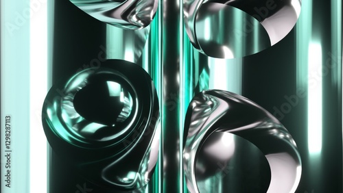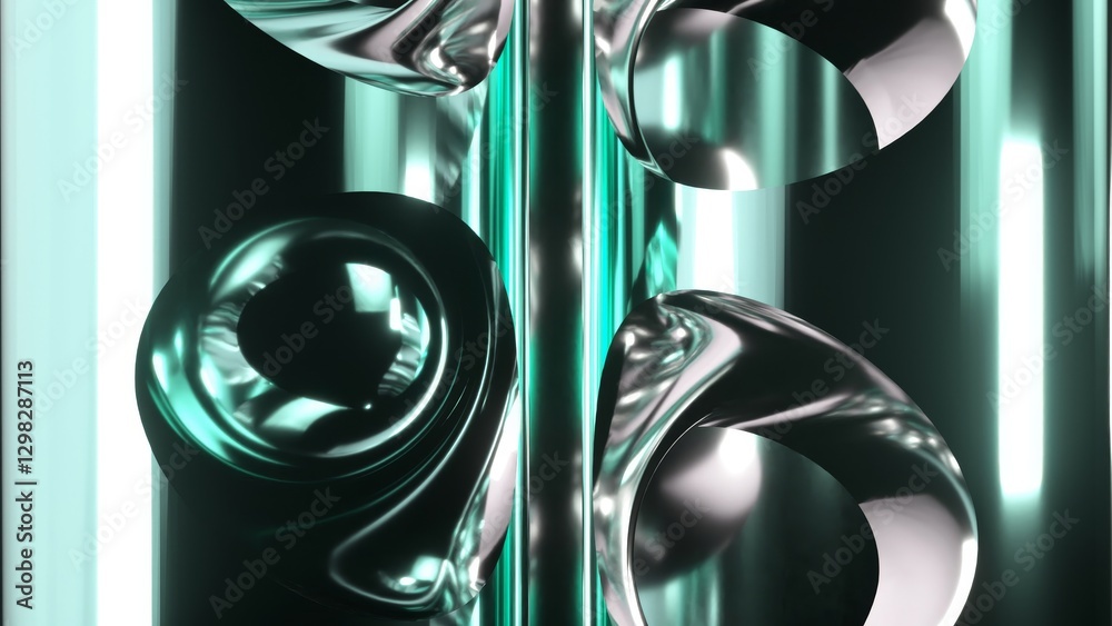 Wall mural : Polished metallic sphere rotates smoothly, surrounded by turquoise swirling shapes and illuminated b