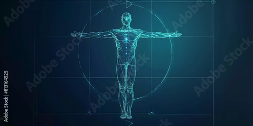 Wall mural polygonal wireframe vitruvian man with futuristic element.