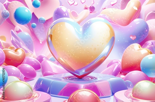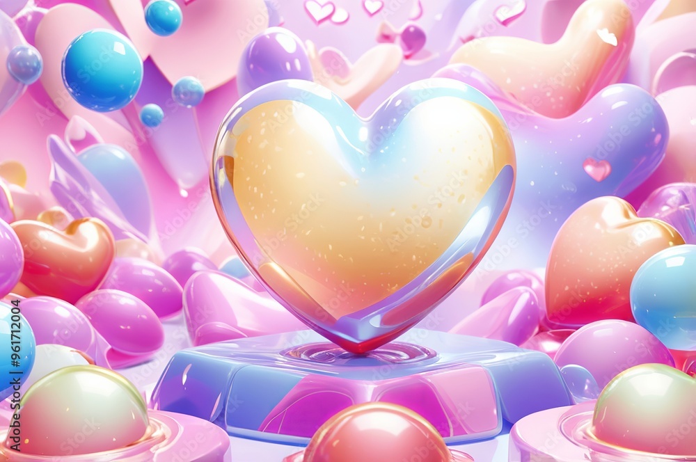 The watermark will not be included on Wall mural.: Pop background featuring an array of glossy, colorful 3d hearts - made with generative ai technology
