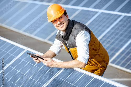 Wall mural : Portrait of a happy engineer in protective helmet standing with digital tablet on a solar power plan