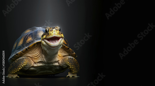 Portrait of a happy smiling turtle, photo studio set up with key light, isolated with black backgrouWall mural