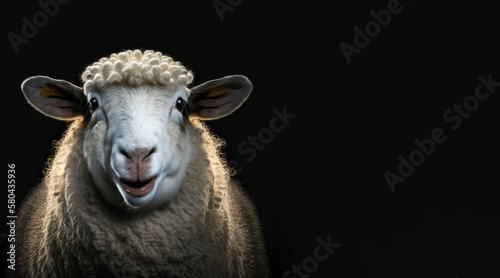 Wall mural portrait of a happy white sheep, photo studio set up with key light, isolated with black background  - Wall murals Wall mural portrait of a happy white sheep, photo studio set up with key light, isolated with black background - Wall murals