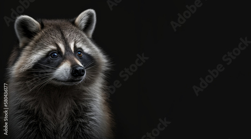Wall mural : Portrait of a raccoon, photo studio set up with key light, isolated with black background and copy s