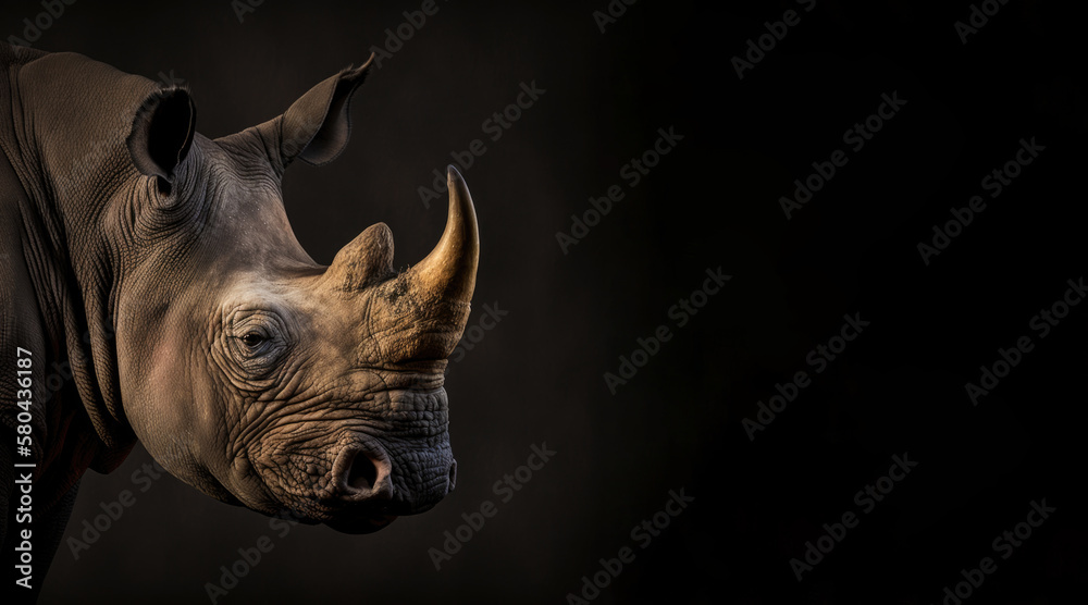 Wall mural portrait of a rhino, photo studio set up with key light, isolated with black background and copy spa - Wall murals Wall mural portrait of a rhino, photo studio set up with key light, isolated with black background and copy spa - Wall murals