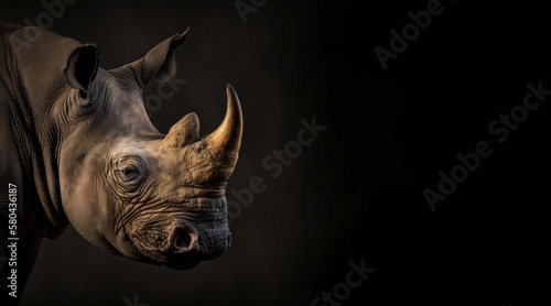Wall mural : Portrait of a rhino, photo studio set up with key light, isolated with black background and copy spa