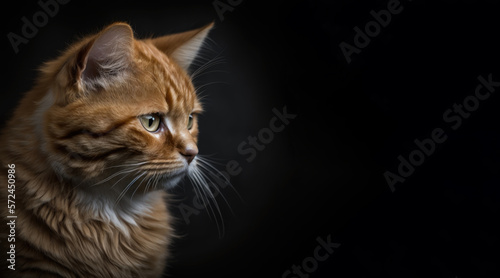 Wall mural portrait of a sad ginger cat, photo studio set up with key light, isolated with black background and
