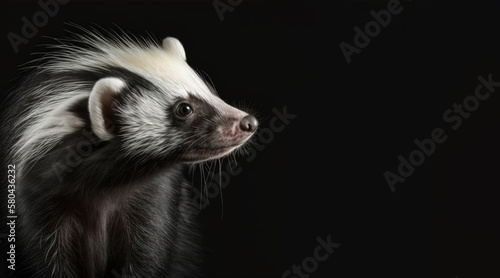 Portrait of a skunk, photo studio set up with key light, isolated with black background and copy spaWall mural
