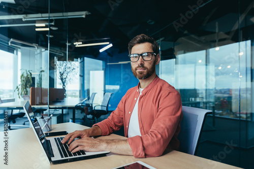 The watermark will not be included on Wall mural.: Portrait of a successful programmer inside the office, a man with a beard, glasses and a red shirt l