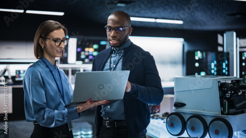 The watermark will not be included on Wall mural.: Portrait of a team of two engineers collaborating on developing a robot for deliveries in a manufact