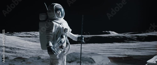 Portrait of asian lunar astronaut standing with a flag pole on the moon surface - easy to track and aWall mural