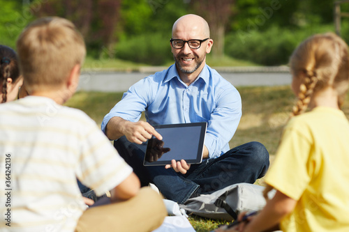Wall mural portrait of bald male teacher pointing at tablet screen and smiling while talking to group of childr