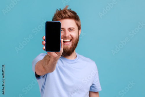 Wall mural portrait of bearded man holding out mobile phone and looking at camera with toothy smile and positiv