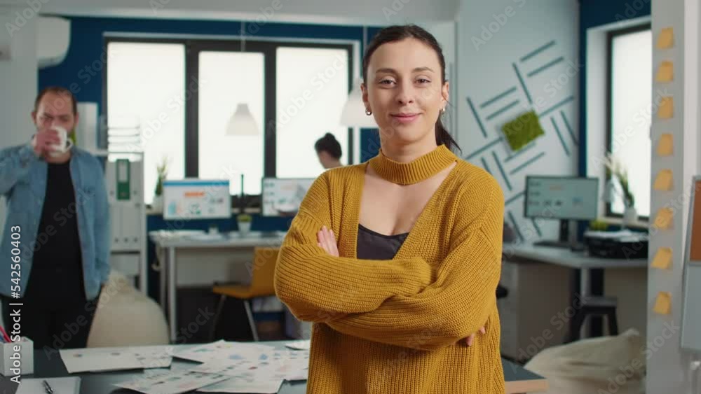 Wall mural : Portrait of confident startup employee entering frame posing with arms crossed and smiling in busy m