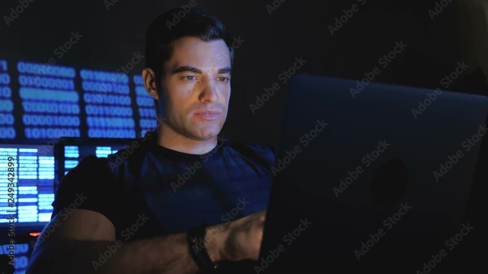 The watermark will not be included on Wall mural.: Portrait of developer programmer working on computer in a data center filled with monitor screens -