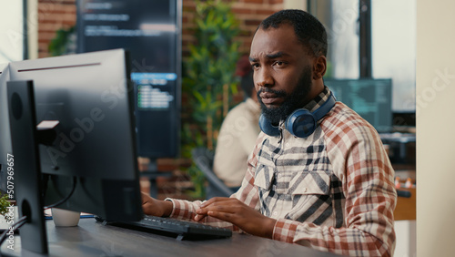 The watermark will not be included on Wall mural.: Portrait of focused african american programer wearing wireless headphones working looking at comput