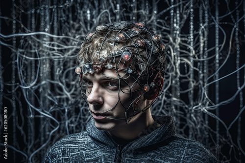 The watermark will not be included on Wall mural.: Portrait of man connected to neural networks - concept of future of artificial intelligence - generati