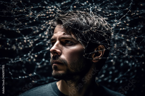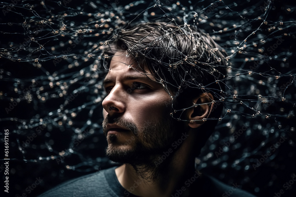 The watermark will not be included on Wall mural.: Portrait of man working with neural networks in cyberspace - concept of artificial intelligence and v