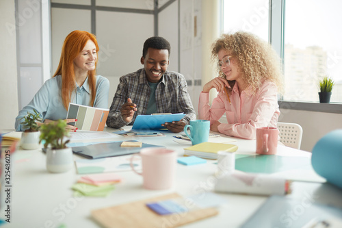The watermark will not be included on Wall mural.: Portrait of multi-ethnic designers team smiling cheerfully while discussing creative project in mode