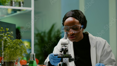 The watermark will not be included on Wall mural.: Portrait of scientist taking leaf sample with micropipette putting on slide under microscope for med