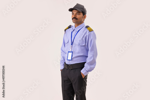 The watermark will not be included on Wall mural.: Portrait of security guard looking elsewhere with hands in pockets