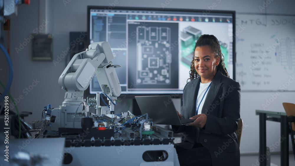 Wall mural : Portrait of smiling black developer using laptop while working with robotic arm in modern university